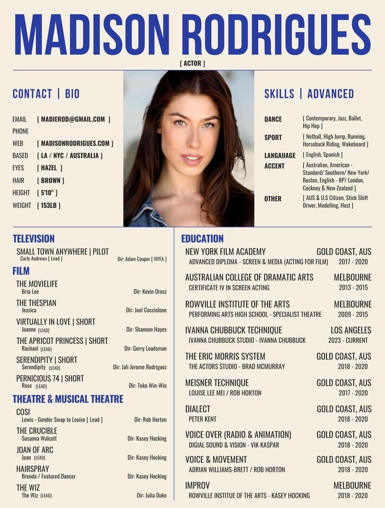 In September 2022, I packed up my life and relocated to Los Angeles to further develop my craft and career. I currently train with Ivana Chubbuck and am drawn to psychologically layered roles that explore power, vulnerability, and complex relationship dynamics.